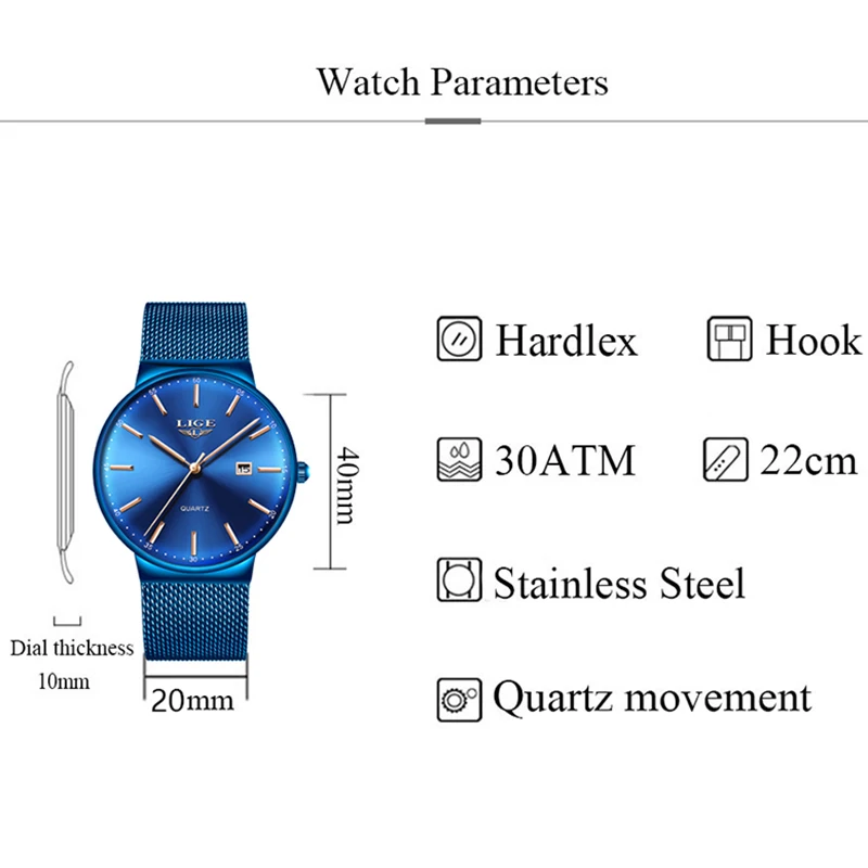 Lige Womens Watches Top Brand Luxury Analog Quartz Watch Women Full Blue Mesh Stainless Steel Date Clock Fashion Ultrathin Dial